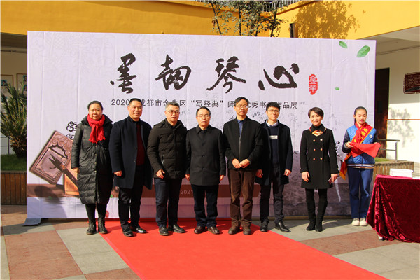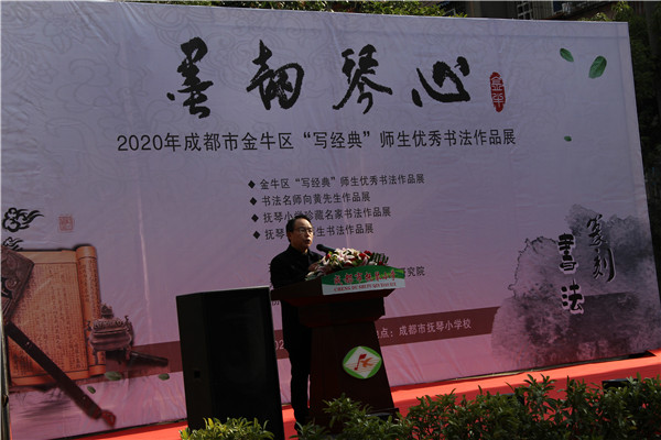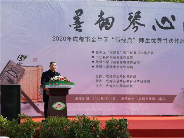 书法作为一门优秀的传统艺术,它源远流长,博大精深,是我国古代文化中的瑰宝。弘扬祖国传统艺术是我们义不容辞的责任。为丰富金牛区师生的文化艺术生活,弘扬民族文化精神,展示全区师生书法风采,促进学校书法艺术教育的科学发展,提高全区师生的书法兴趣和书写能力,2021年1月11日下午,“墨韵琴心”——金牛区2020年“写经典”师生优秀书法作品展暨书法名家作品展在成都市抚琴小学举行。金牛区教育局分管领导,普教科负责人,区教科院院长,省市知名书法家,成都市五区教育联盟第十七组共同体学校领导,街道、社区和兄弟学校领导,全区美术书法教师及抚琴小学师生代表等参加展览活动开幕式。
