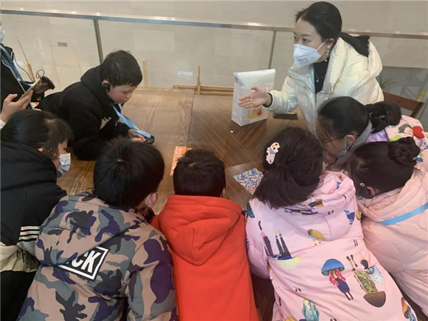 参观中,在博物馆讲解员的带领下,孩子们了解了蜀绣的起源,认识了织机构造,还近距离欣赏了五彩的丝线。这次的蜀绣蜀锦体验课,不仅有讲解聆听,还有互动探索。在“探秘寻宝”环节,小伙伴们还找到了绣着五星红旗的蜀绣袖套,粟特纹饰的衣服。