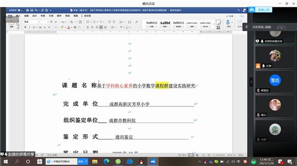 2021年1月26日,成都高新区芳草小学《基于学科核心素养的小学数学课程群建设实践研究》课题组邀请北京师范大学赵茜教授对课题进行指导。中午12点,课题组核心成员准时上线,与赵茜教授进行交流互动。