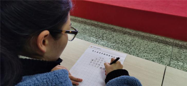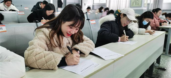9点半,选手在阶梯教室进行“硬笔书法”项目。老师们伏案攥笔,教育的赤诚之心从笔尖流淌,凝结成一幅幅书法作品,彰显教育工作者的情怀与魅力。
