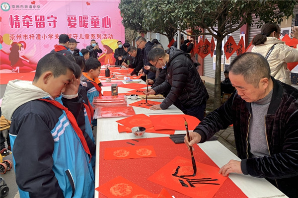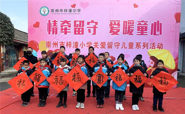 2021年1月30日,四川省崇州市梓潼小学开展“情牵留守.爱暖童心”为主题的关爱留守儿童活动。共青团崇州市委书记、市关工委副主任赵疆,市政府责任区督学刘加兵、周锡福等莅临现场,观看了全校留守儿童及学生代表的啦啦操表演、葫芦丝演奏、手语舞等才艺展示;学校美术老师指导同学们剪纸;市硬笔书法家协会主席贾国良带领10多名书法家现场挥毫泼墨,为孩子们写春联、送“福”字,让幸福传递!