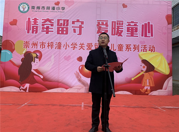 梓潼小学校长、关工小组长杨建斌致辞,衷心感谢各位领导对梓潼小学留守儿童的关心、帮助与支持,并借此要求孩子们:铭记社会各界的深情关爱,懂得感恩;努力学习,刻苦钻研,练好本领,为将来成为社会栋梁之材奠定基础;拥有一颗爱心,无论何时都要关爱他人,长大以后更要积极回报社会,传递爱心。