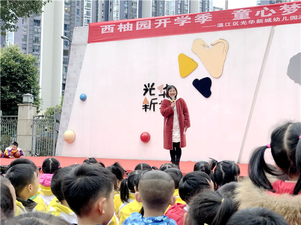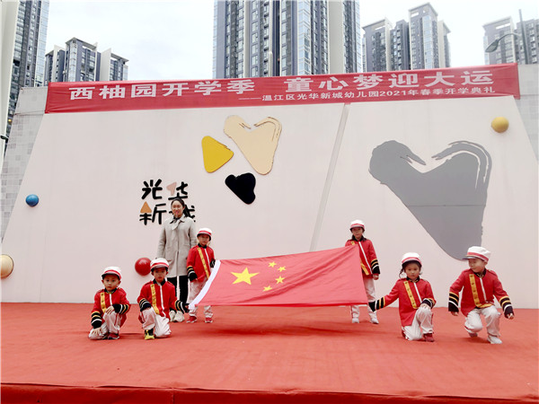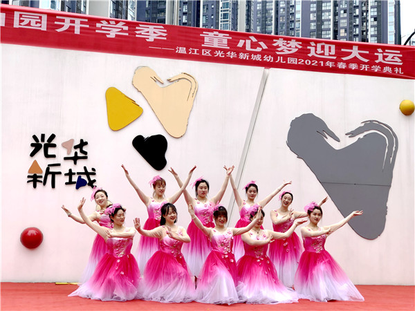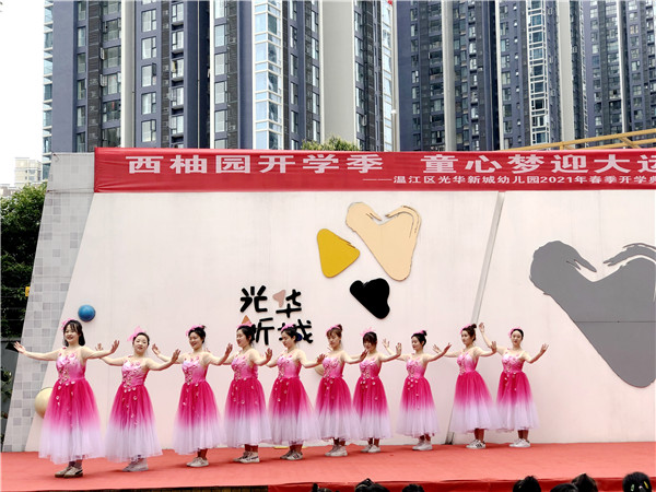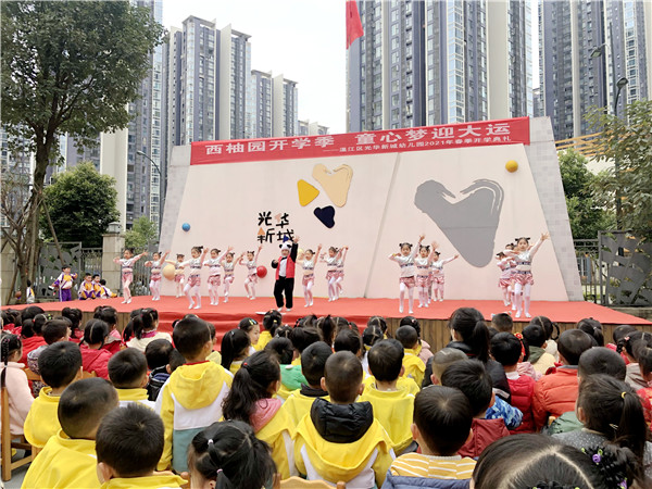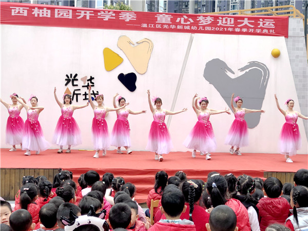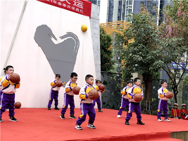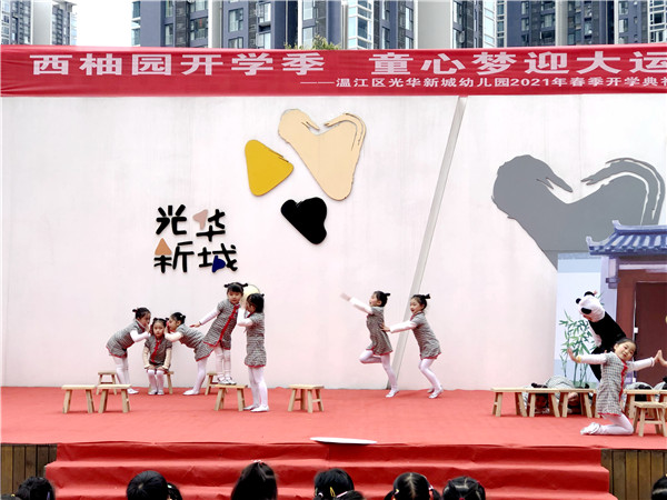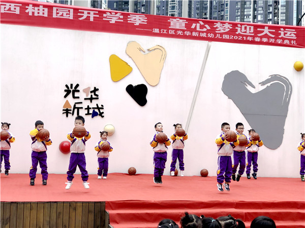 在慷慨激昂的国歌声中,光华新城幼儿园师生共同唱响《义勇军进行曲》。紧接着,大班幼儿带来了精彩的开场舞《酷炫篮球》,用朝气蓬勃、向阳而生的气势,展示球技,鼓励更多小伙伴一起加入运动的队伍。随后,节目《童心迎大运乐活在成都》将活动推向高潮,孩子们用整齐划一的动作和完美的情景故事舞出喜迎大运的灵动精神,并将运动的种子根植在心中。