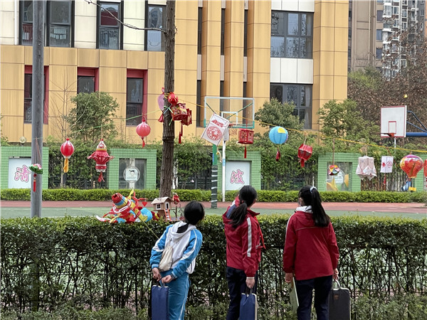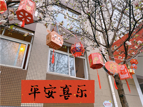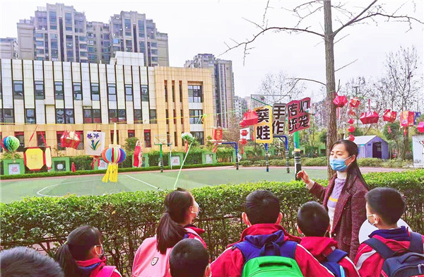 刚踏入校园,迎接孩子们的是花间绿下一串接一串的“红”。这是清波葵娃们在寒假劳动实践活动中制作的传统手工灯笼。“牛气冲天”“年年有鱼”“出水芙蓉”……他们用灵巧的双手将身边的生活废旧物品变成了一个个造型各异的灯笼。