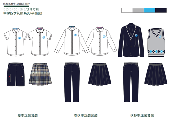 校服是学校精神内涵的外在标志,新世纪外国语学校的校服时尚、雅致、青春、阳光,选用了不褪色、不起皱、不缩水、透气性好的合格面料,在保证学生健康的同时,也体现出朝气蓬勃的时代感。新世纪外国语学校有六套校服,分别是手感轻柔的夏季运动套装、精致立领的春秋季运动套装、实用保暖的冬季运动套装、透气吸汗的夏季礼服套装、经典雅致的春秋季礼服套装和端庄简洁的冬季礼服套装。男生着裤装,女生多着裙装,二者在衣领及袖口等细节方面也有区分。女生裙装里的内衬安全不透色,冬季的防寒服和大衣都足够抵御成都的冬天。