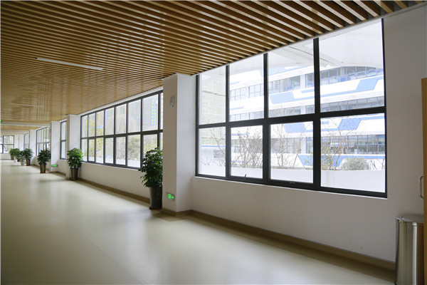 视线通透,不仅是因为教室里一整面的大窗户,也因为新世纪外国语学校的建筑全都采用回字形设计,单边教室,宽大走廊,不会有教室对着教室的逼仄。并且这个走廊,更是堪称成都市学校最宽最安全的走廊。国家标准的单边走廊是在1.8-2.2米之间,大学教学楼走廊两边均有教室时也是2.1-3米之间,而新世纪外国语学校的单边走廊就有4.2米。并且走廊也安装了不能彻底打开的大窗户,比栏杆更加有效地防止同学们有跌落的危险。