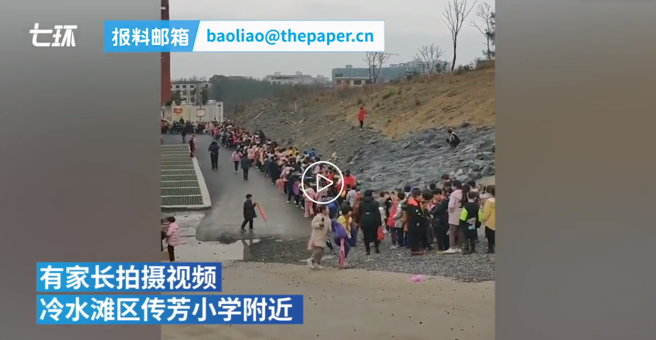 近日,湖南永州。有家长拍摄视频质疑,许多孩子在冷水滩区传芳小学门口排起数百米长队,等待进校。学校工作人员表示,午休时间未开门,故学生在门口排队,已调整制度解决。