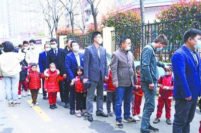 爸爸接送孩子格外开心。记者彭年 摄