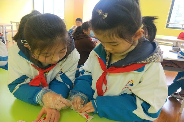 在包糖环节,孩子们纷纷自己动手,脸上洋溢着快乐的笑容。
