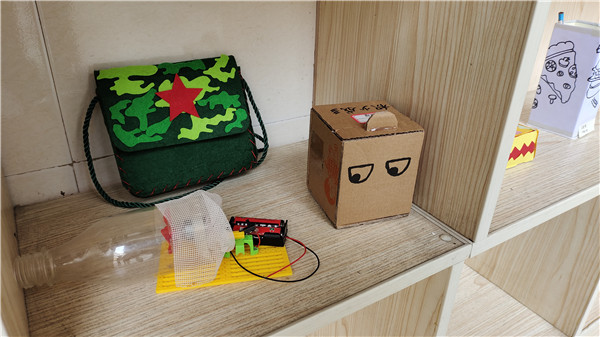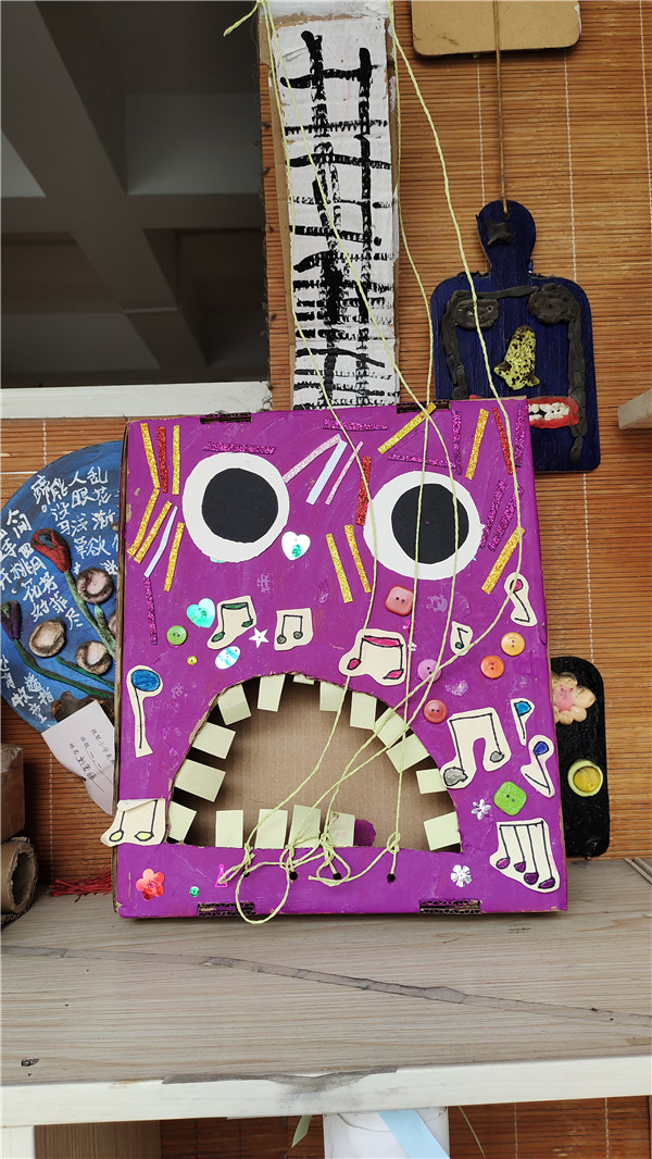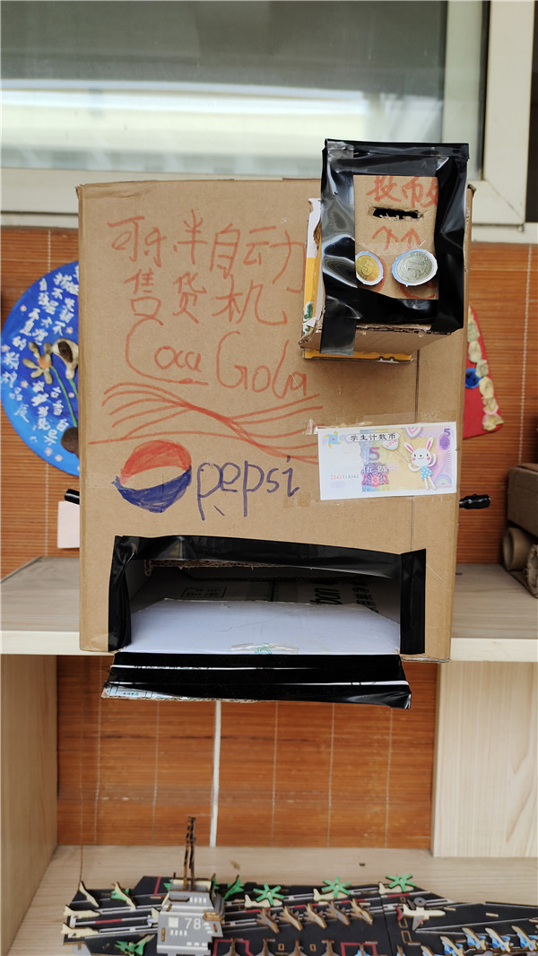 一个小小的纸箱也被大家充分利用。不仅使用废纸箱做出了怪兽乐器,连投币式可乐自动贩卖机都被孩子们通过硬纸箱展示在大家眼前。