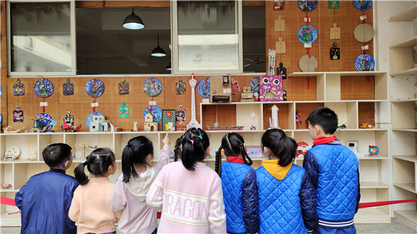 作品一经摆放好,便吸引了孩子们的注意,不一会儿文化廊外就围满了一群兴奋讨论的学生。