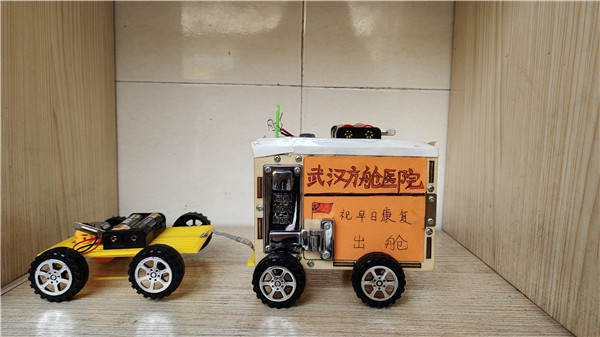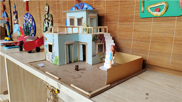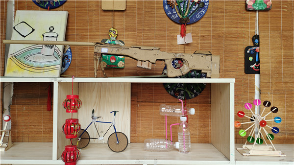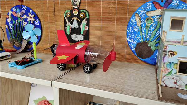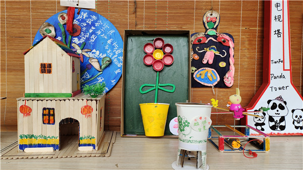 一个个精美的手工作品摆放在孩子们眼前,有利用废旧光盘、易拉罐制作自行车的;有利用彩色纸片制作花瓶、花篮、花伞的;还有一个孩子为疫情防控修筑了方舱医院……