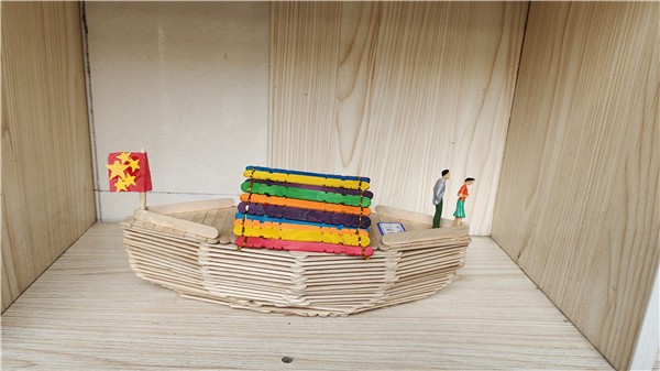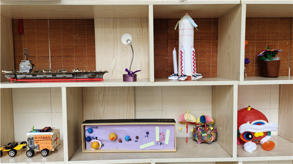 小小的展示柜中,下海有竹船龙舟,上天有飞机战舰。孩子们还制做了太阳系、火箭来探索宇宙。