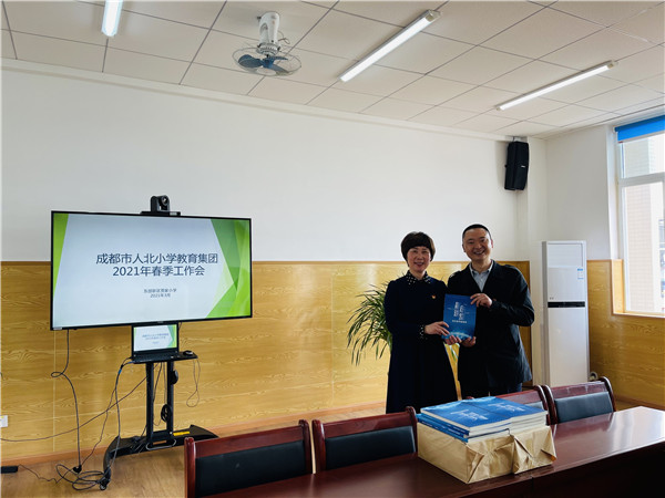 刘艳校长代表人北小学教育集团向贾家小学赠送《四川教育》副主编王建强先生的著作《融创课堂,创生教学新境界》,鼓励贾家小学教师要以学生生命为原点,从“课堂改革”开始,努力实现课堂的双向联动,实现教师自我专业化发展。