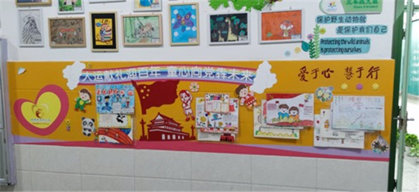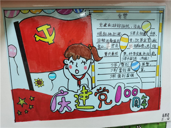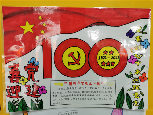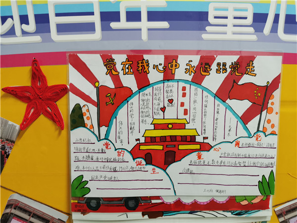 为了响应学校的爱党主题活动,三年级九班的同学们在老师的带领下,积极地在课余时间学习阅览了相关的爱国爱党故事,满怀童心的制作了一幅幅充满了童真和爱党精神的主题海报。在老师及家长的帮助下,孩子们将班级的外墙装饰得焕然一新,精心的打造了一幅美丽的外墙板报,充分的展示了同学们“童心向党,喜迎百年,犇向未来”的美好心愿。