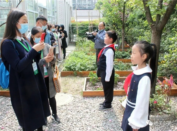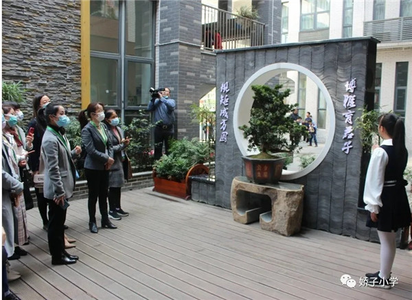 来宾们在娇子小学学生讲解员的带领下,参观了学校聚焦“五育融合”建设的实践体验场所“智慧农场”、川派盆景园“虬曲之韵”;集体验、查询、展示为一体,总面积180平米的《道德与法治》课程专用教室;以四川非物质文化遗产为主题,以互动、体验、实践为核心的近800平米的《蜀风雅韵》课程实施场所。
