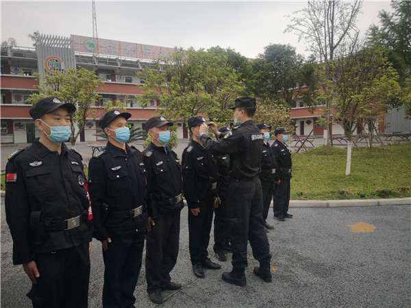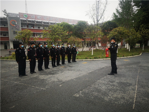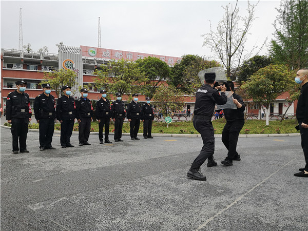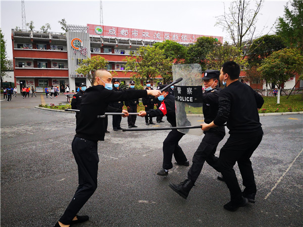 双流保安公司大队长周元对全校安保人员进行了反恐防暴业务培训、消防培训,就怎样使用叉子、盾牌、警棒、辣椒水等工具进行了详细的讲解。队员们还三人一组进行演示,教官在旁边现场纠正,不断规范动作。