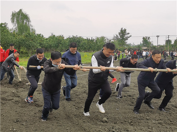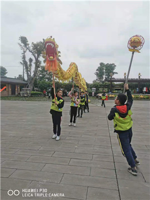 天公作美,出发前天气还是灰蒙蒙、冷冷的,不一会儿天空便放晴,坐在巴士上的同学们一路欢声笑语。转眼间便到达了目的地——成都市郫都区先锋村“农夫记忆”。到达目的地后,在导游的带领下,家长和同学们整队并做了准备工作。一切就绪,导游组织家长和孩子们开展了丰富多彩的素质拓展活动——耕地、栽菜、独龙车、舞龙、挖土豆……