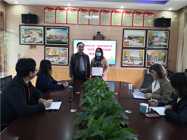 彭镇小学校长夏可玉为廖文娟副校长颁发跟岗培训结业证书