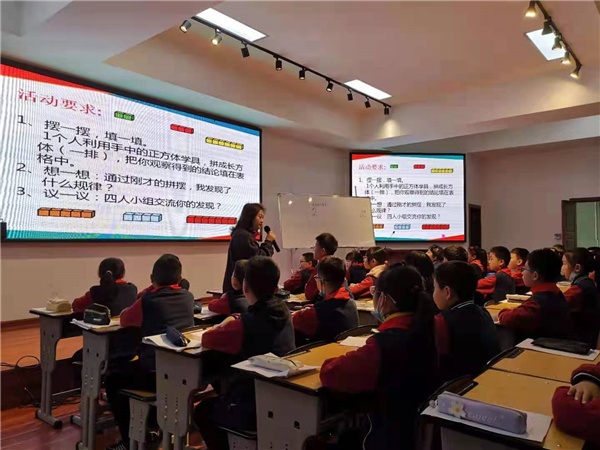 首先,五年级数学组张龙雨老师进行课例展示《表面积的变化》。张老师的课堂主要体现了“通过学生动手操作发现规律,发展学生空间观念”的教学理念。张老师引导学生从简单问题入手,用两个相同的正方体拼出长方体,体验到两个正方体拼成长方体后表面积减少了两个面的面积,进而学生动手用3个、4个甚至更多相同的正方体拼成长方体,探究拼成后的长方体表面积的变化规律。学生通过动手操作、观察、思考、合作交流等,体验并发现拼摆过程中表面积的变化规律,积累了活动经验,发展了空间观念和数学思维。