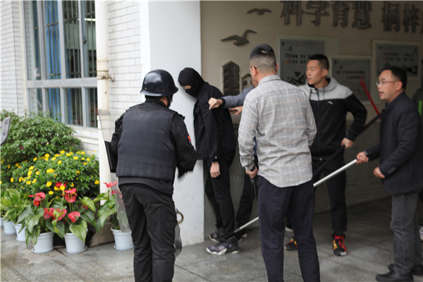 9点22分,扮演歹徒的人员正面闯入学校未果,企图翻墙入校。歹徒出现的同时,当值保安启动一键报警系统,通信员老师用广播通知所有师生进入教室,并做好防止外人闯入的准备。防暴组就地拿好物防装备待命。