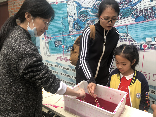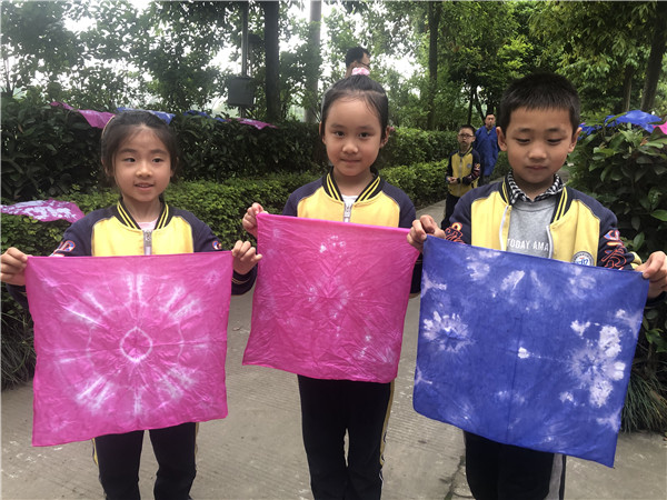 孩子在了解了中国的传统手工染色技术后,学习手工扎染。经过扎结、染色两大步骤之后,小手绢在孩子们手中变成了一朵朵蓝色和红色的花。看到用自己的小手像变魔术一样染出变化万千的图案,孩子们心中无比自豪。