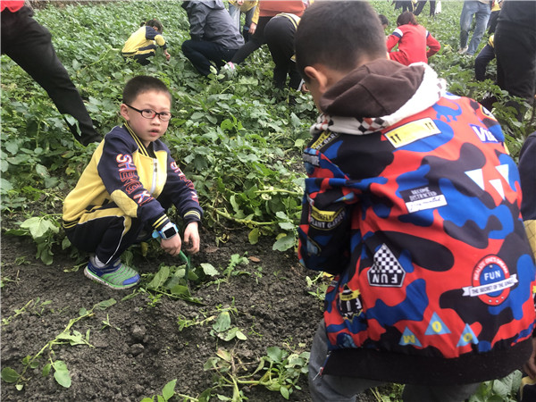 刚下过雨的地里,土豆叶像绿色的地毯铺了一地。孩子们迫不及待地跳进地里,用手拔、用耙子刨,不一会儿大家的筐子就装满了劳动胜利的果实。来之不易的劳动成果也让小朋友们真正明白了那句“谁知盘中餐,粒粒皆辛苦”。