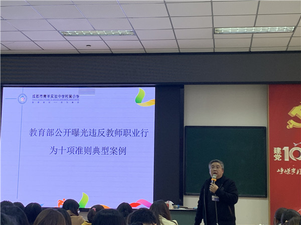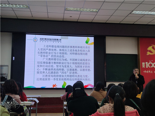 为进一步贯彻落实党的教育方针,不忘立德树人初心,规范教师从教行为,近日,成都市青羊实验中学附属小学开展了师德师风教育。