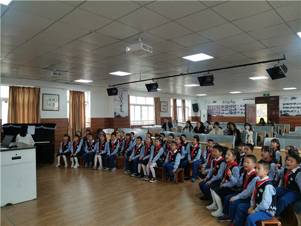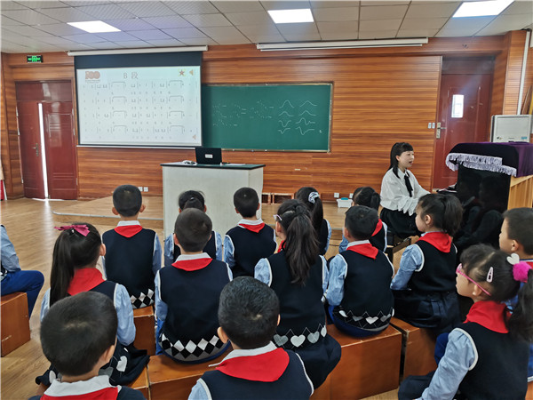 上午第三节课,学校德育主任兼音乐老师胡琦在四楼多媒体教室展示了爱国主义题材的歌曲——《闪闪的红星》一课,通过多种教学手段使同学们感受歌曲带来的雄壮气势。二年级的同学们在胡老师的带领下,用高亢有力的歌声传承红色经典。