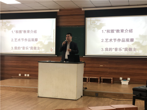 上午第四节课,学校党支部书记、校长邱伯成就学校的办学理念、和雅教育品牌、艺术学科的概况等进行了分享。