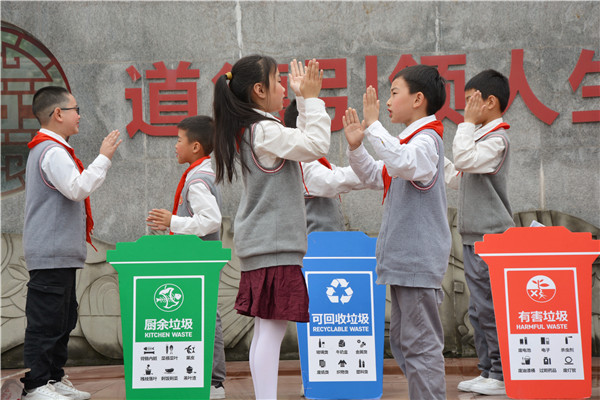 听了他们的介绍,同学们明白了垃圾大致可分为可回收垃圾、厨余垃圾、有害垃圾、其他垃圾四类,分别用蓝色、绿色、红色、黄色来表示。