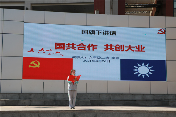 2021年4月26日,成都市成华区教育科学研究院附属小学(以下简称:成华教科院附小)在全校集体朝会上开展了主题为《国共合作 共创大业》的少先队员讲党史、学党史活动。六年级二班的少先队员代表秦琼同学详细为大家介绍了历史上国共经历的两次合作。