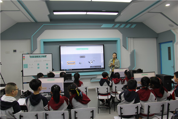 解北一小任姝环老师带来了一节研究课《水能溶解多少物质》。首先,通过一段实验实拍视频导入本课,引导学生关注“怎么设计实验”“为什么一份一份加”“怎样区分是否完全溶解”;随后,通过一段实验实拍视频让学生了解“食盐和小苏打在水中溶解实验操作方法”,并完成30ml水能溶解多少食盐和小苏打的实验;最后,学生利用3D资源,开展实验拓展,探究白糖、味精在水中的溶解。