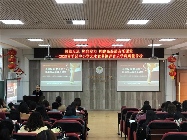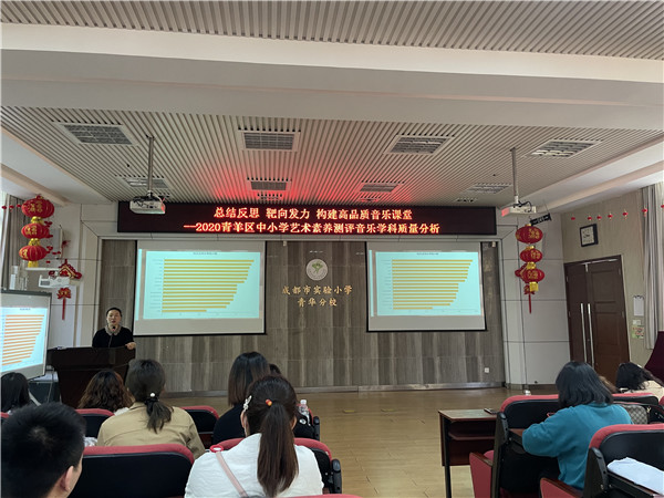 2021年4月27日上午,在成都市实验小学青华分校(以下简称:实小青华)学术报告厅举行了主题为《总结反思靶向发力构建高品质音乐课堂——2020青羊区中小学艺术素养测评音乐学科质量分析》的青羊区音乐学科教研活动。