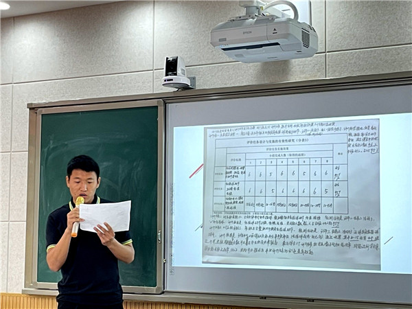 课程结束后,全体教师齐聚未来教室,以课程量表为依据,各小组展开讨论。各小组负责人用《评价任务设计与实施的有效性研究》的四个量表,分别从“评价任务设计要素对应、评价任务实施过程、评价任务实施效果、课堂运动负荷”四个方面进行推论和优化建议。随后,由各小组细化分析量表内容及推论,由小组代表进行交流、分享。