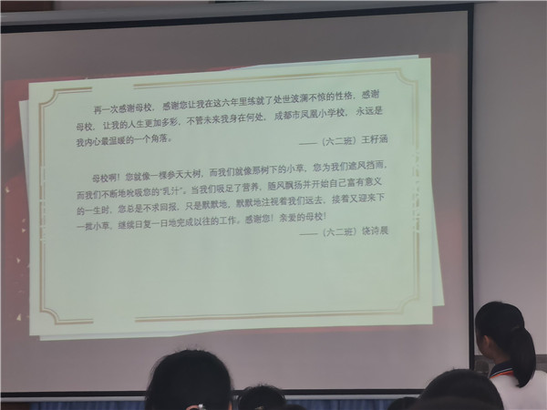 活动最后,孩子们齐唱校歌《唯留芬芳桃李间》。成都市凤凰小学校一直以来积极关注学生的身心健康发展,此次毕业班心理主题活动的开展,及时帮助了毕业班学生解除心理疑惑,缓解了心理压力。