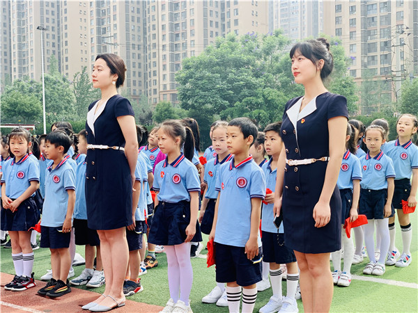 全体立正,辅导员老师在队旗下庄重的为新一批队员戴上了红领巾,鲜艳的红领巾在胸前飘扬。