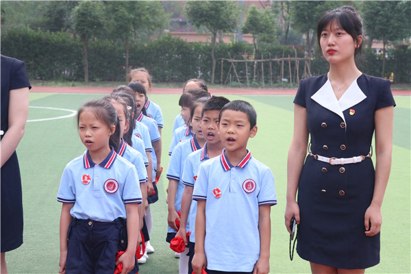 大队辅导员何老师在仪式的最后带领全体少先队员在鲜红的队旗下进行了呼号,并对活动进行了总结,向新一批加入中国少年先锋队的队员们再次表示了祝贺,希望他们能更加严格的要求自己,爱祖国,爱劳动,爱科学,勤奋学习,全面发展。要做好身边的小事,时时刻刻用最美的行为习惯为红领巾增添新的荣誉。