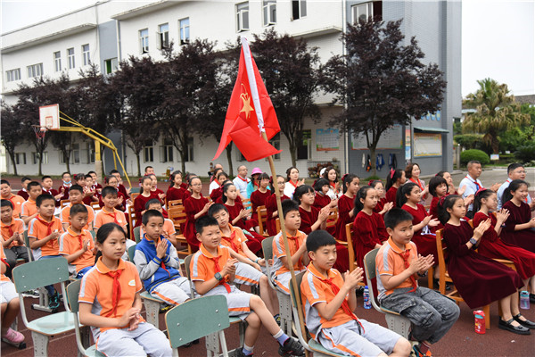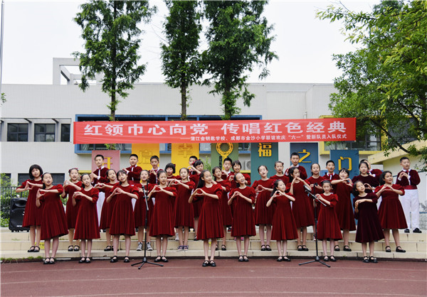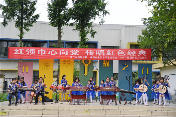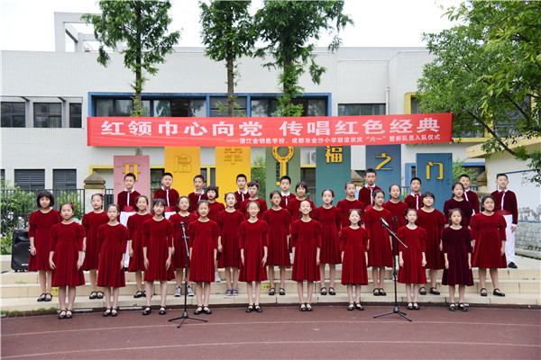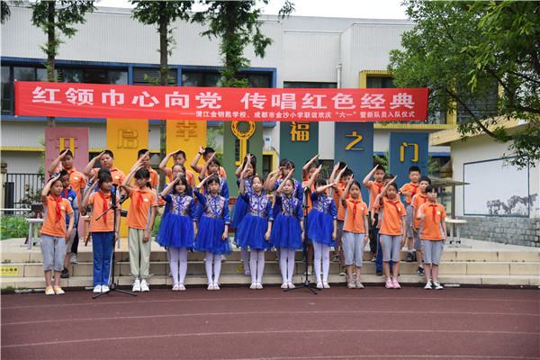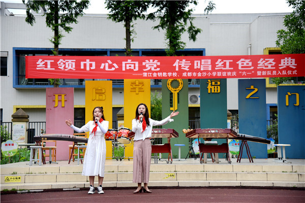 为庆六一,在刘玥廷副校长的带领下,成都市金沙小学五年级合唱团的同学和张池老师、龙洁滢老师、刘潇老师一行四十余人赴蒲江县金钥匙学校开展“红领巾心向党,传唱红色经典”——蒲江县金钥匙学校、成都市金沙小学联谊欢庆“六一”暨新队员入队仪式。