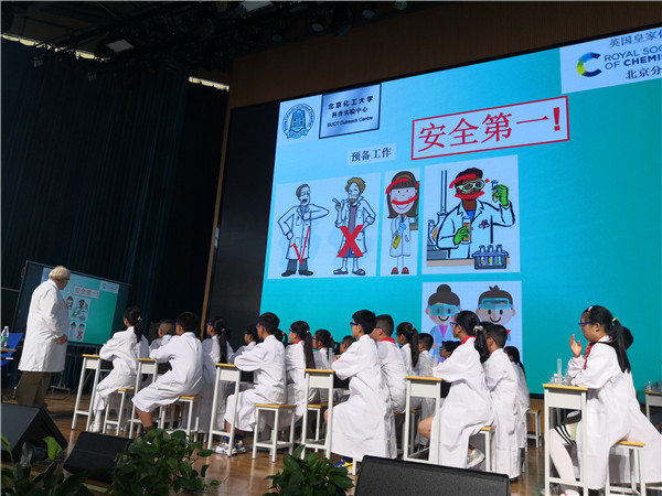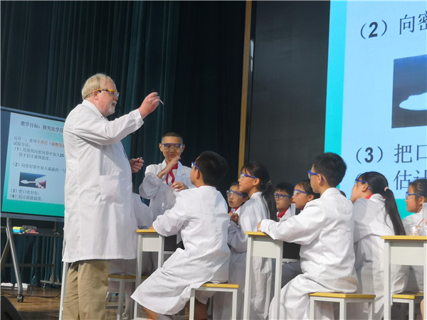 北京化工大学特聘教授、“化学魔法师”洋教授戴伟先生呈现了两节趣味课《制冷制热》和《谁是维C王》。戴伟老师以流利的中文,严谨的内容,精妙的实验设计,培养了学生们的科学思维、动手能力和安全意识,启发小朋友热爱科学,了解科学,学习科学。并为大家做了《趣味化学之旅》的精彩报告。