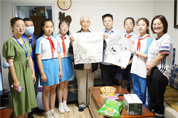 紧接着,丁校长一行来到老复员军人周爷爷家里,少先队员们为爷爷唱起了老歌《让我们荡起双桨》。周爷爷也将自己的水墨花鸟画送给了学校,同时希望少先队员们能够好好学习,担负起新时代的使命。
