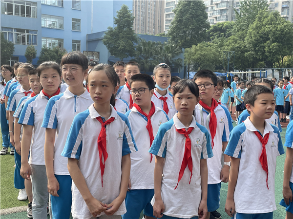 为持续关注学生身心健康,舒缓学生的心理压力和焦虑不安等负面情绪,确保广大学生以积极阳光的心态面对学习和生活,在此期末考试复习阶段,成都市泡桐树小学境界分校(以下简称:泡小境界)于2021年6月28日举行了主题为“阳光心态,积极迎考”的国旗下活动,帮助学生进行自我调节,掌握科学的心理调节放松方法。
