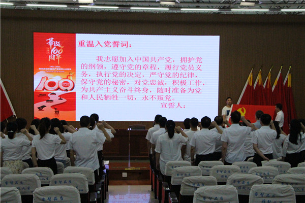 会议开始,全体党员在党员干部蒋燕同志的带领下,高举右拳,面对党旗,再次庄严宣誓。