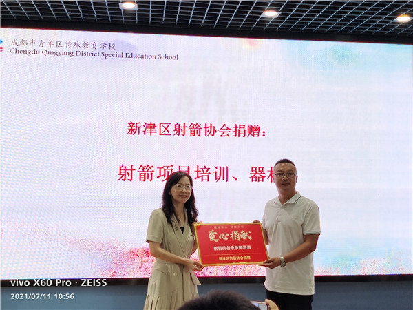 活动现场还进行了捐赠仪式,成都博木炎创科技有限公司为此次公益项目捐赠活动所需的设备及服务,新津区射箭协会为青羊特校捐赠射箭项目的培训服务和器材。