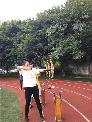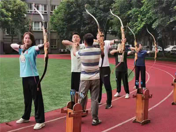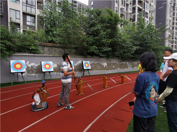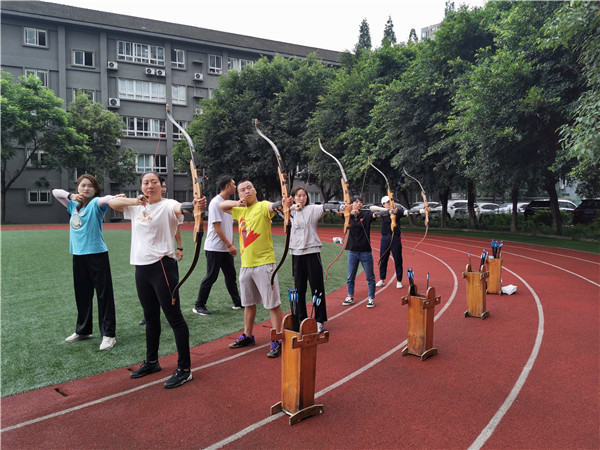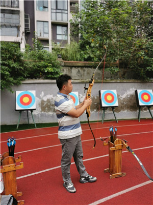 马教练仔细讲解了站位、备弓、起弓、引弓、固势、撒放、收势等射箭基本姿势和各项要领,配合一遍遍地示范和手把手地纠正姿势,通过两天的教学活动让老师们在浓厚的兴趣中初步掌握了射箭基础。
