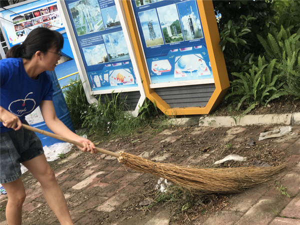 下午两点,航天小学两个支部六个党小组,带着年级组的团员志愿者,分别在甲乙两个校区开展清扫活动。烈日下,志愿者们齐力打扫校园卫生,天气炎热,大家累得汗流浃背,也不停地挥动手里的工具,只为净化校园。经过两个小时的努力,校园卫生大清理工作结束。