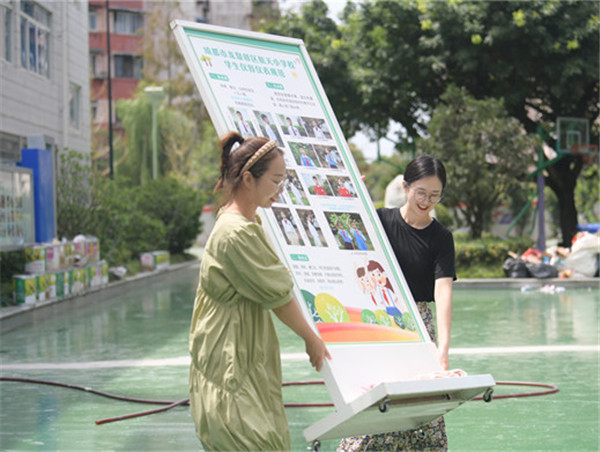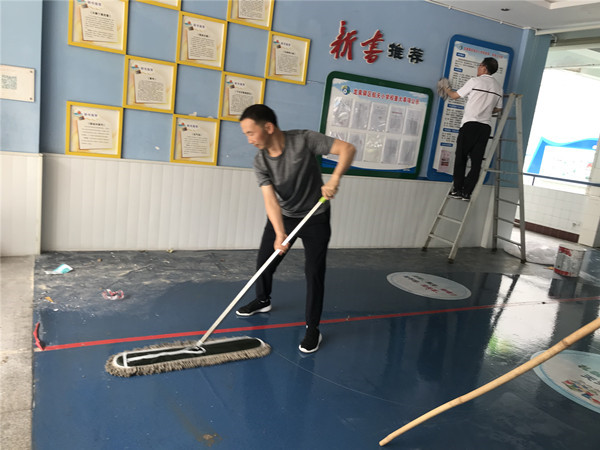2021年8月24日,全校党员同志、团员教师回到校园,看到新粉刷的墙壁、新装修的校门厅、新安装的办公室书柜、新修建的操场,不由得心情激动。然而,在修建和美化之后,校园里还堆放着废旧杂物、建筑垃圾,还有布满灰尘的橱窗、过道等,这些问题如果只靠清洁工是来不及迎接师生返校的。航天小学党员、团员志愿者为让师生及时返校,决定为校园清洁出一份力。