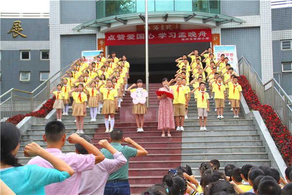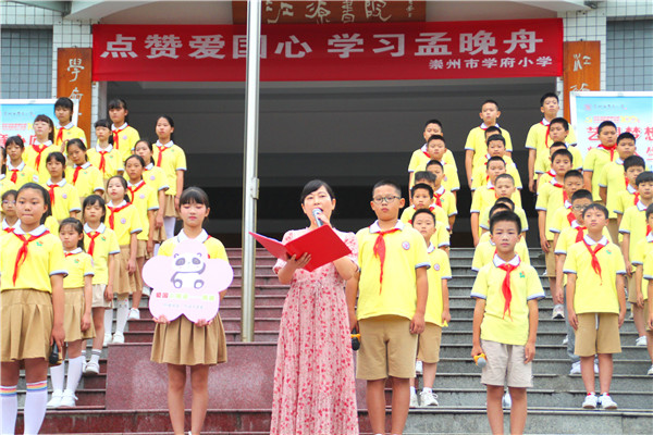 鲜艳的五星红旗下,学府小学全体师生庄严宣誓:像屈原那样爱国,宁为玉碎不为瓦全;像岳飞那样爱国,精忠报国誓死捍卫;像钟南山那样爱国,医护万民,逆行而上;像抗日先烈那样爱国,前赴后继以命相搏;像航天英雄那样爱国,精于专业追求卓越;像边防战士那样爱国,以身守护寸土不让;像奥运冠军那样爱国,十年磨剑,亮剑必胜。