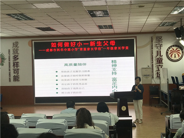 2021年9月26日下午,成都市科华中路小学“青蓝家长学校”邀请到武侯区家长总校家庭教育特邀专家罗琴,采用线下和线上直播的方式,为一年级新生家长开展了主题为“如何做好小一新生父母”的专题讲座。