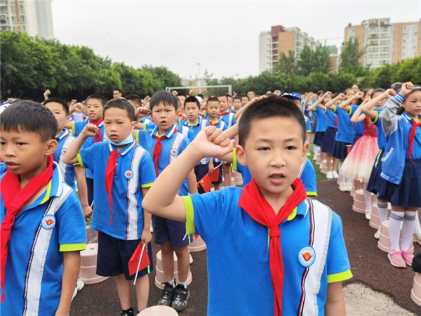 在激扬的歌声中,由少先队的老队员给新队员戴上鲜艳的红领巾并互敬队礼。在火红的队旗下,新队员们昂首挺胸,高举右拳,在大队辅导员雷老师的带领下,庄严宣誓!